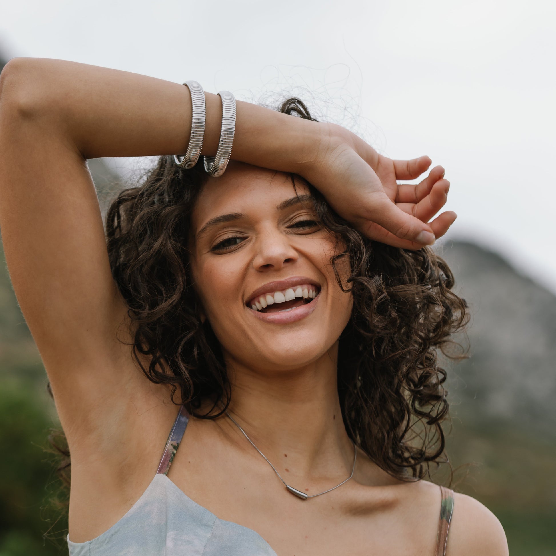 Our most popular bangle is now available in silver. The most comfortable bangle you will ever own. This bangle has a gentle stretch that makes it easy to slip on and wear.