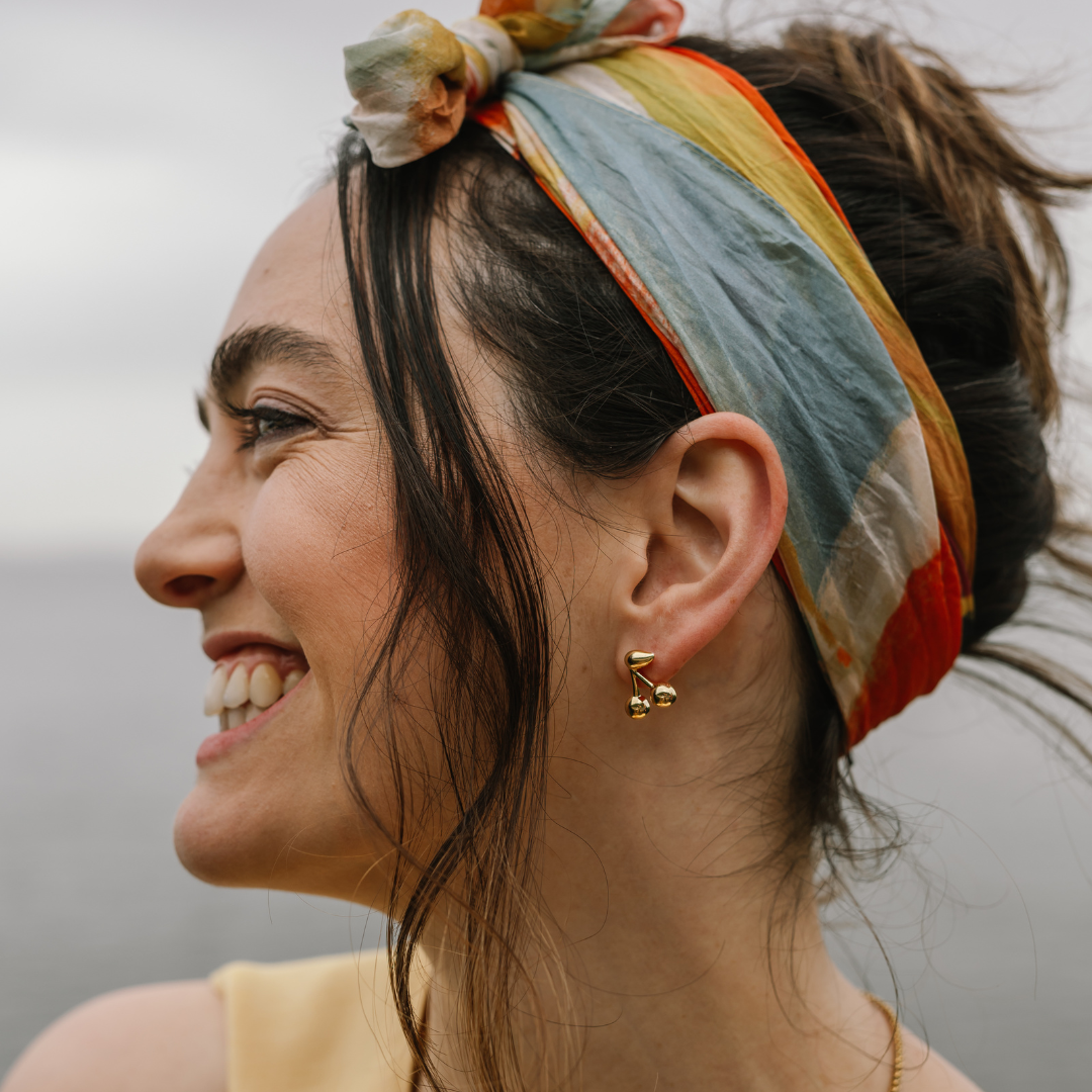 These large cherry studs in gold is the perfect summer accessory. Add a touch of whimsy to your outfit with these earrings.