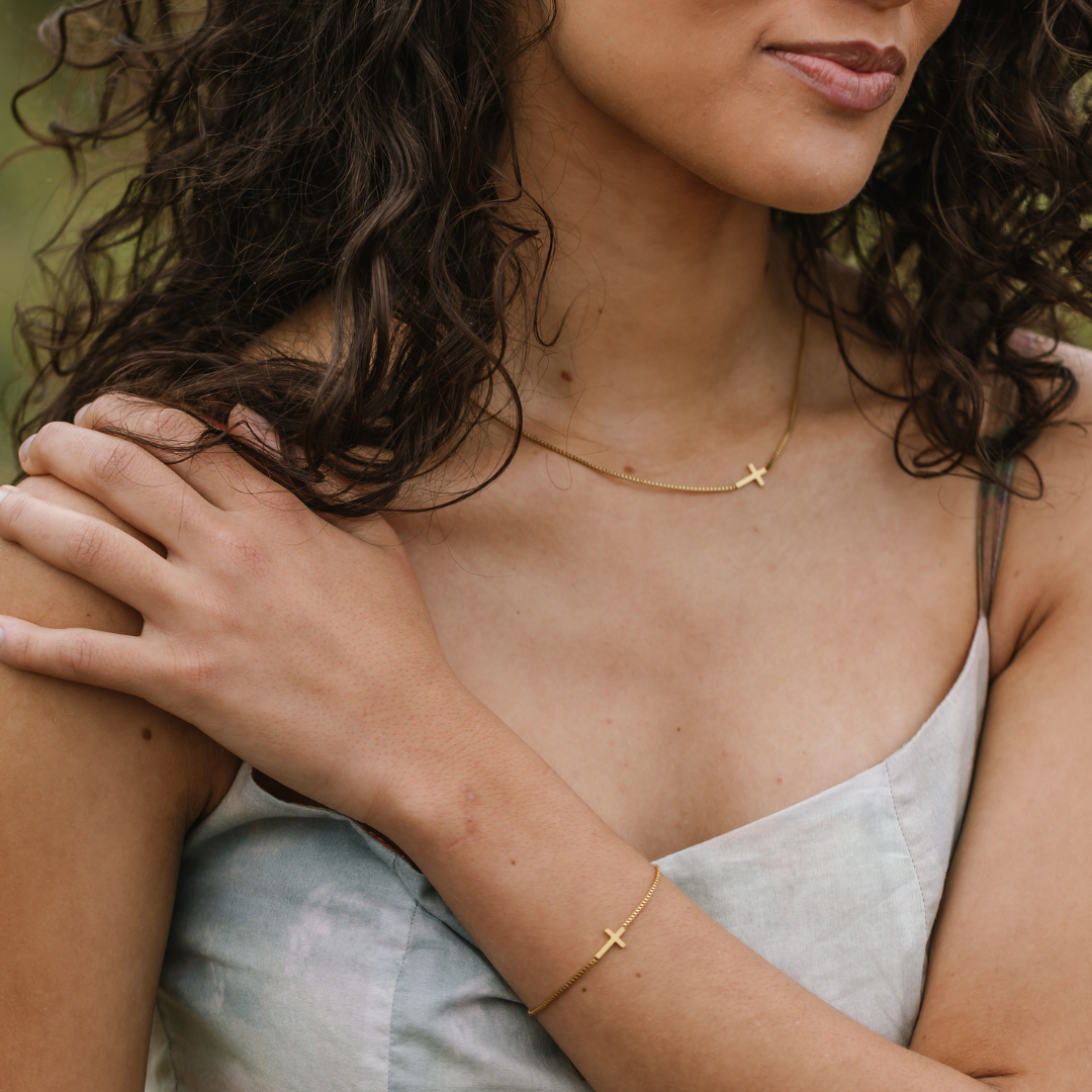 The Cross bracelet is a minimalistic bracelet with a subtle cross pendant. Also available as a necklace.