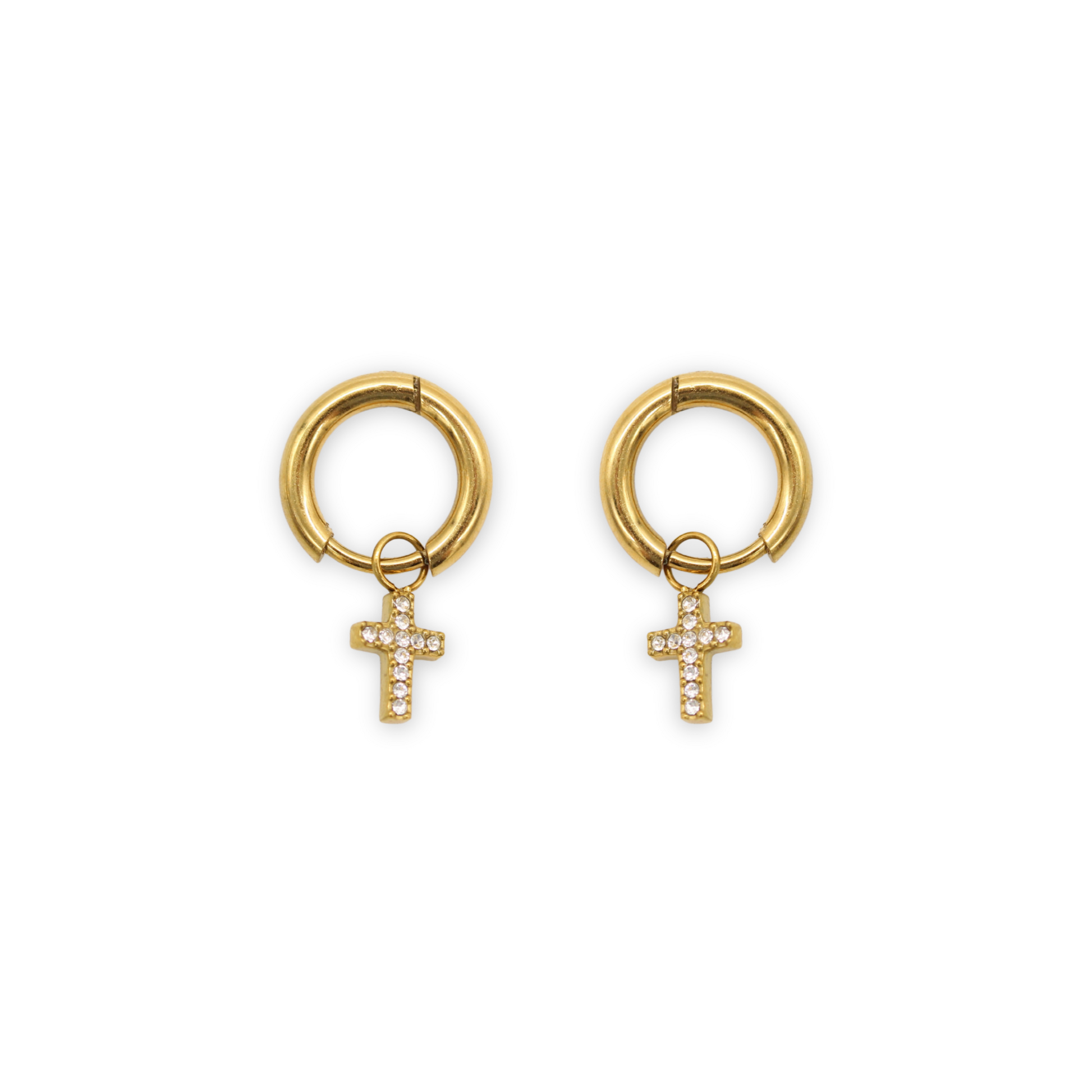 A hinged hoop with a dangling cross pendant set with cubic zirconia stones for a simple, striking finish.