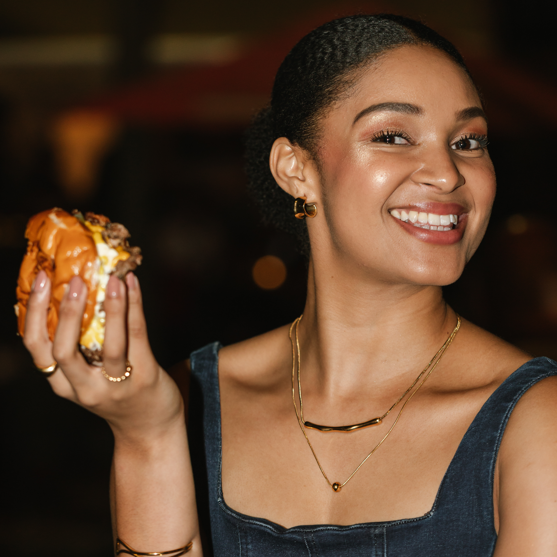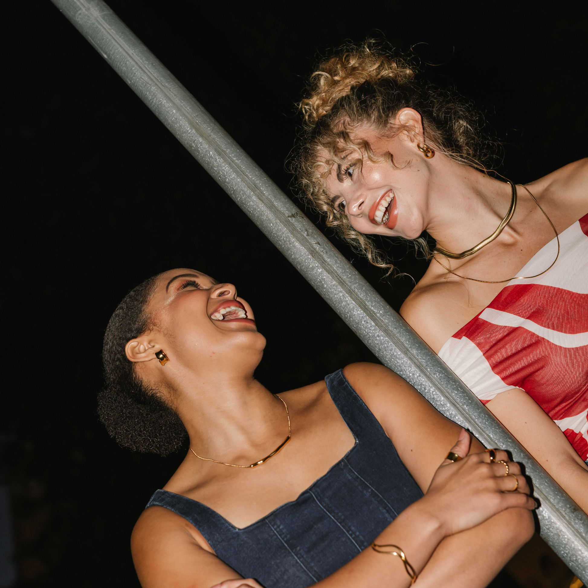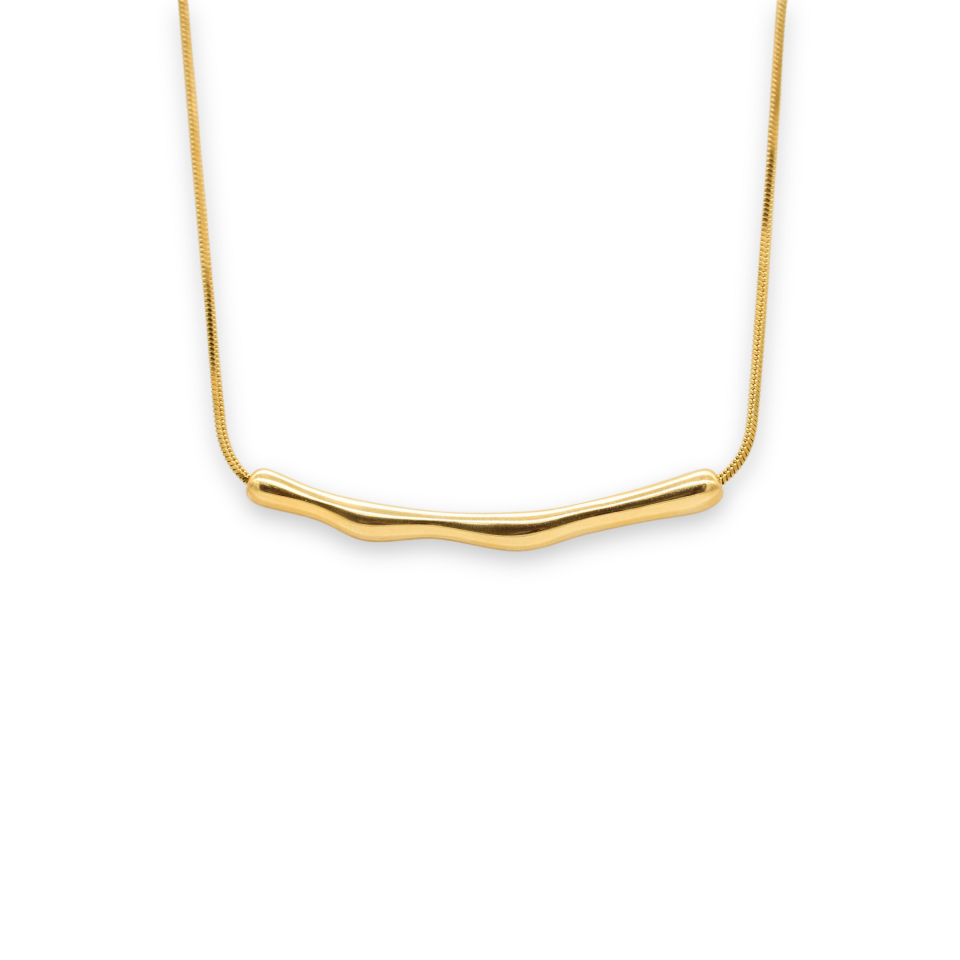 Elegant with a modern, organic edge, this necklace makes a subtle statement. A thin round snake chain features a horizontal, curvy gold bar for sculptural impact.